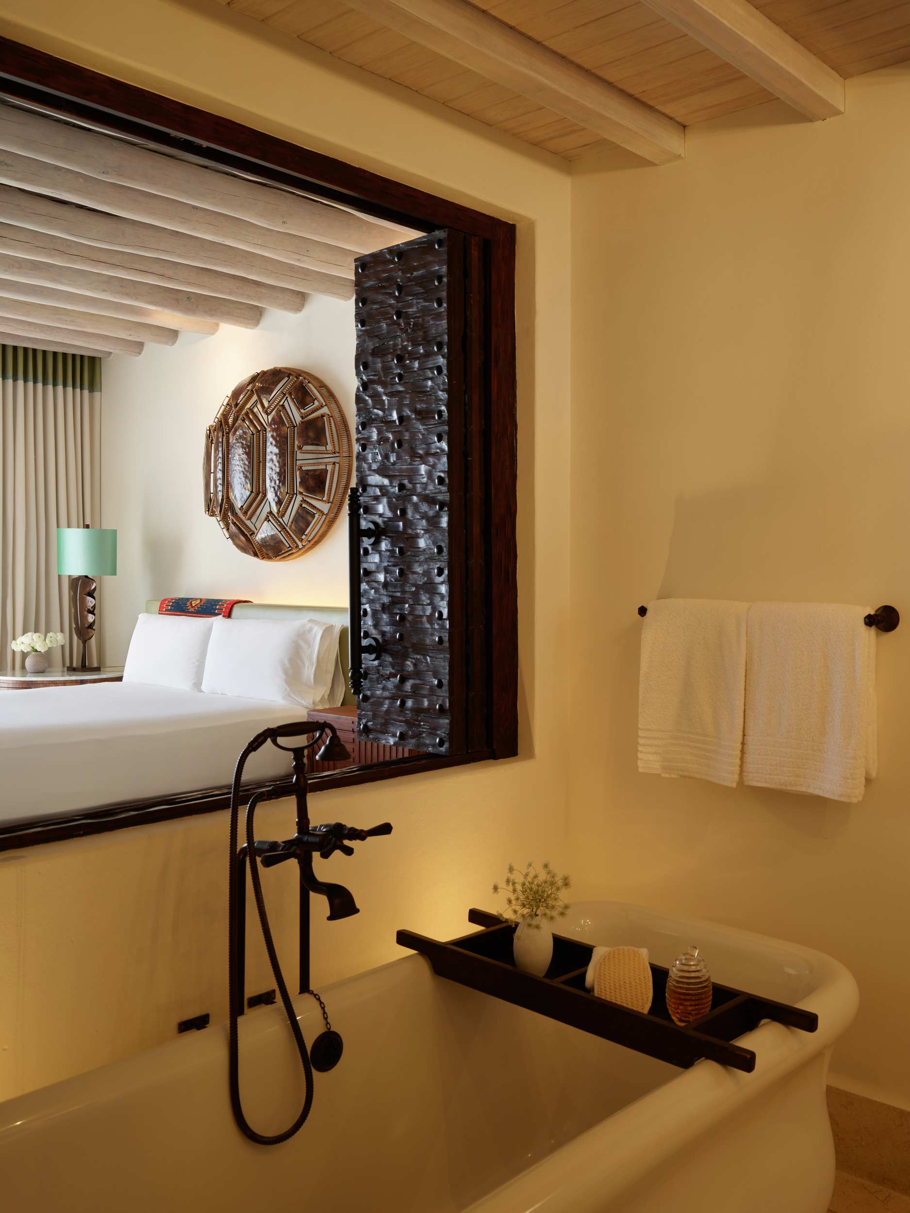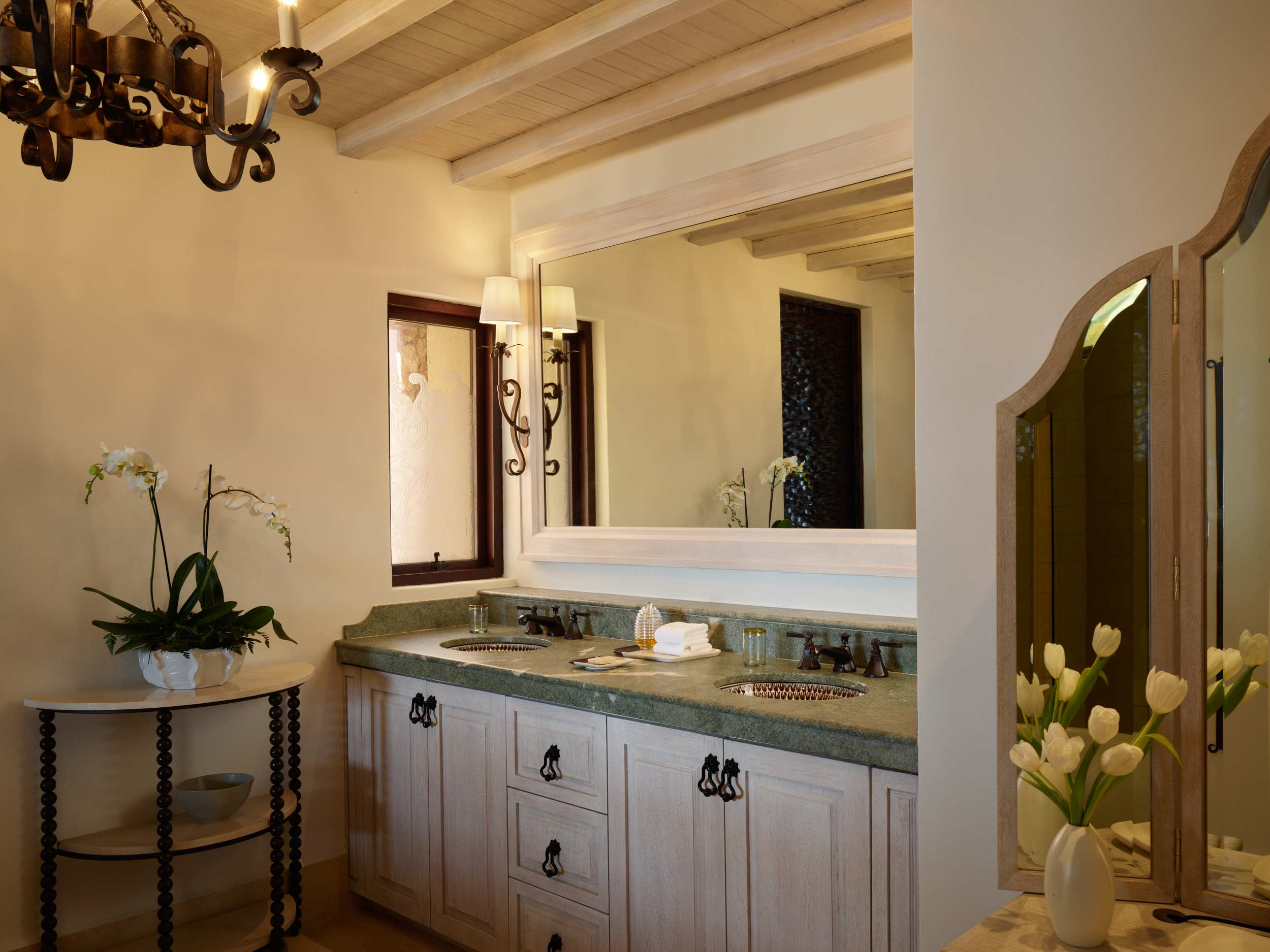 Spa-inspired bathroom featuring a soaking tub, separate rainfall shower featuring Mexican tile, double hand painted vanity and custom bathroom amenities made in Mexico.