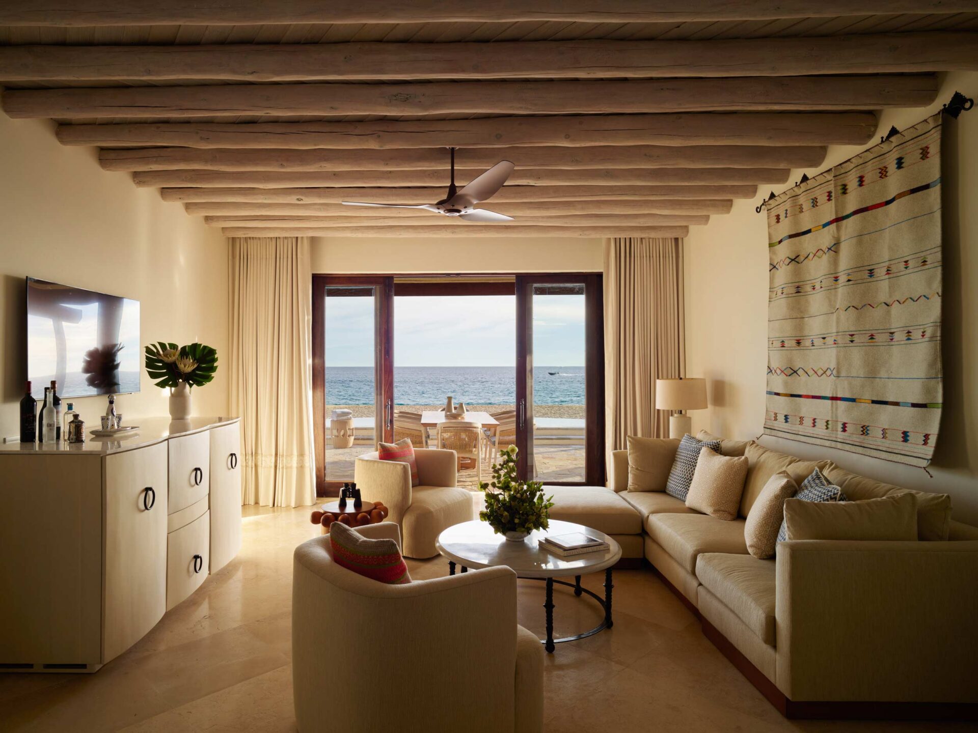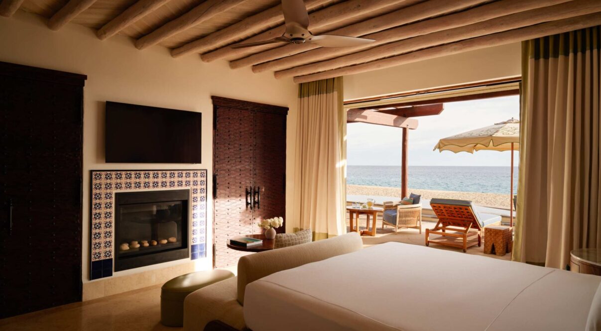 La máxima expresión de vida frente al mar: nuestra suite premium de dos habitaciones ofrece un amplio jardín, piscina privada, fogata y acceso directo a la playa, todo con servicio de mayordomo y un interior tan impresionante como su entorno. Con 2,594 pies cuadrados de sofisticación, esta suite cuenta con dos habitaciones con cama king, cada una con baño estilo spa, chimenea y terraza con camastros junto a la alberca. El patio principal incluye un área de comedor al aire libre, mientras que los espacios interiores están diseñados para relajarse, disfrutar de una cena o incluso trabajar con total comodidad. Incluye un tequila Premium de bienvenida y guacamole diario con cerveza mexicana.