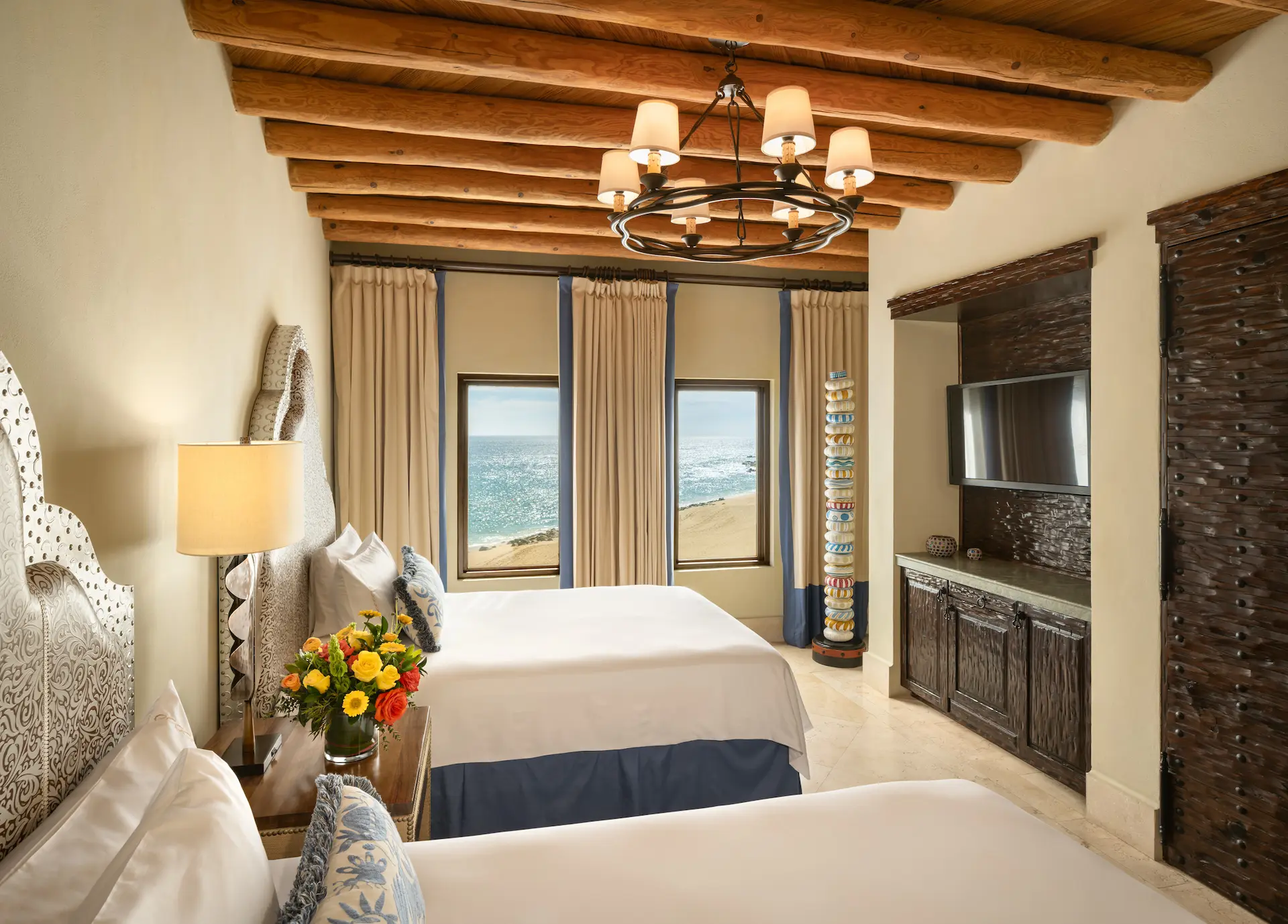 Ocean-view room with two queen beds, wood beams, chandelier, and coastal decor.